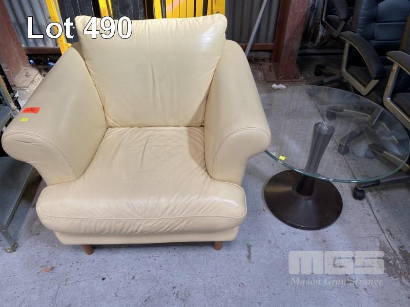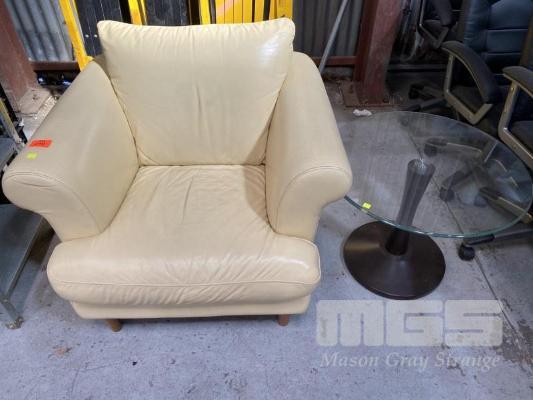 ARM CHAIR, TAN LEATHER LOOK & GLASS TOP COFFEE TABLE