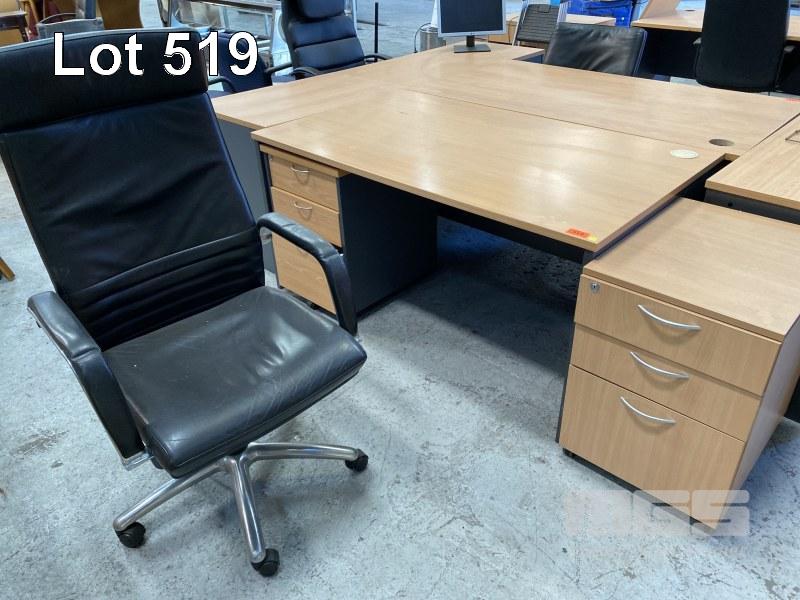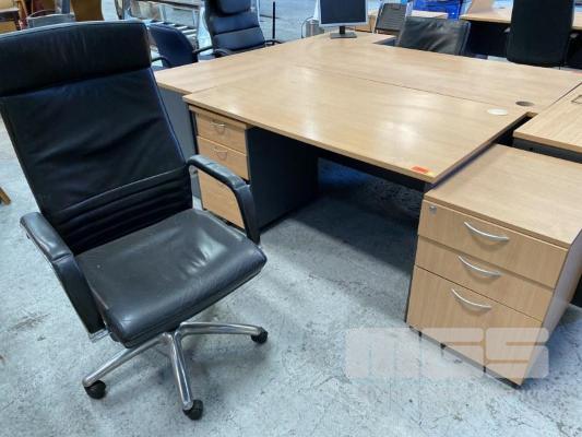 DESK, 180 x 90cm, BEECH/IRONSTONE WITH RETURN, 2 x 3 DRAWERS MOBILES & BLACK VINYL ARM CHAIR
