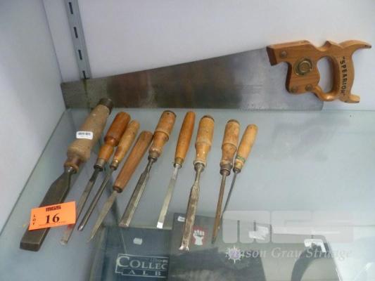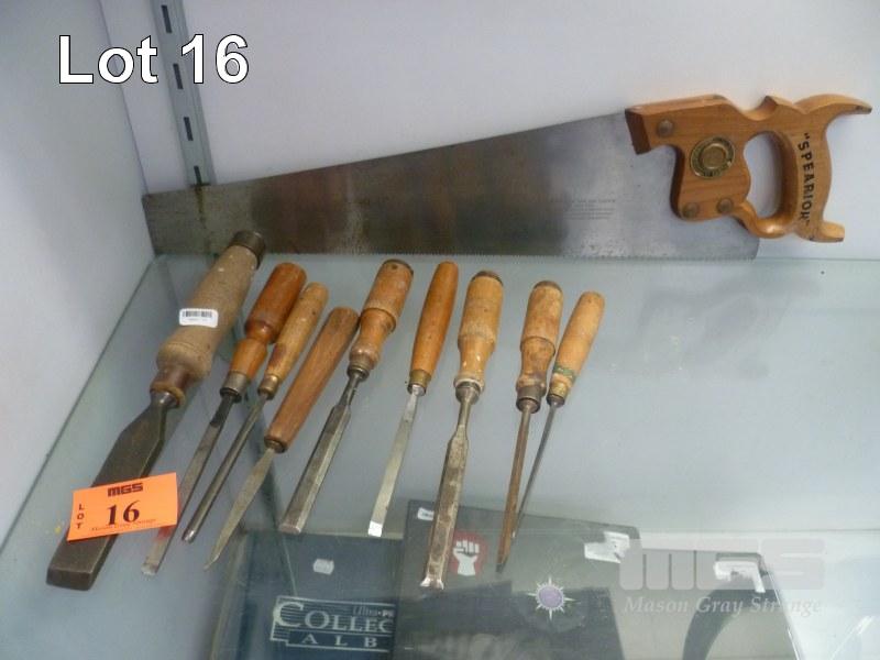 9 x VINTAGE CHISELS & SPEARIOR No88 HAND SAW