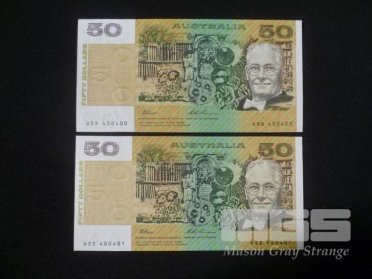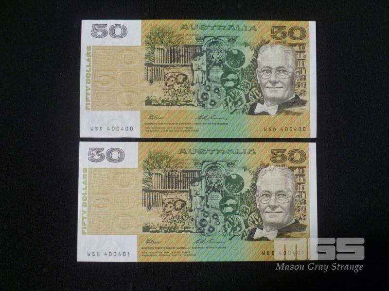 1993 2 x $50.00 NOTES CONSECUTIVE WITH REPEATER "400400" UNC