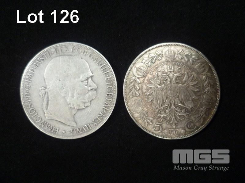 2 X AUSTRIAN 5 CORONA SILVER COINS,1900 & 1907