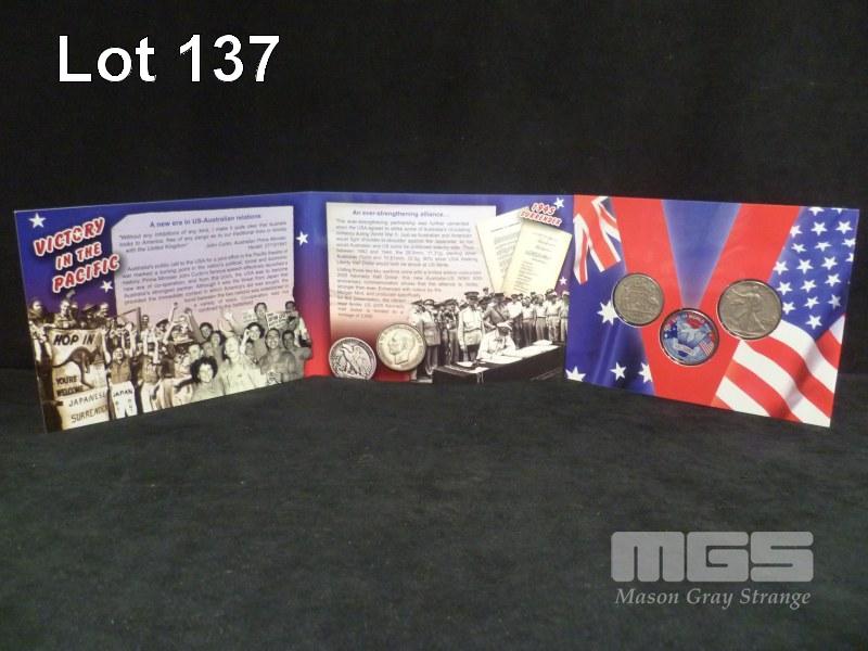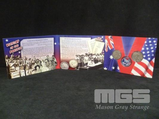 END OF WW2 60TH ANNI COIN PACK, FLORIN + USA HALF DOLLAR + COLOURED MOMENTO