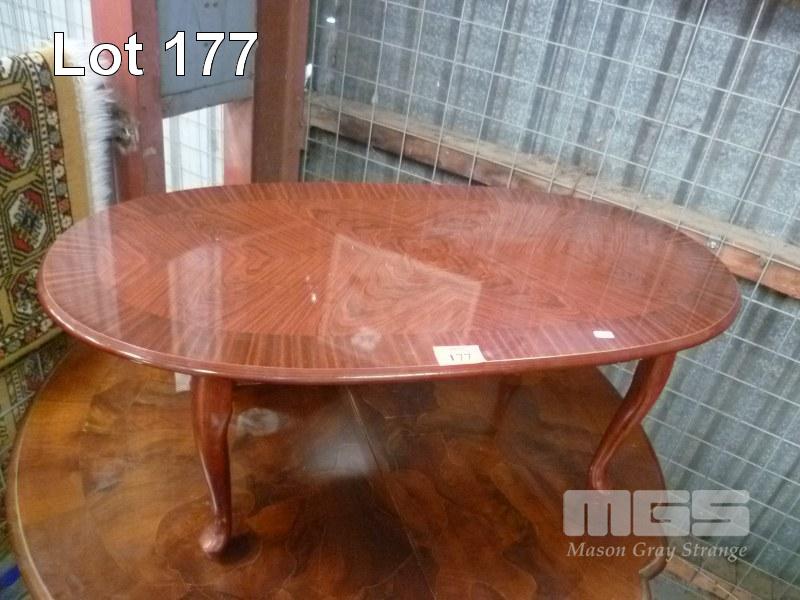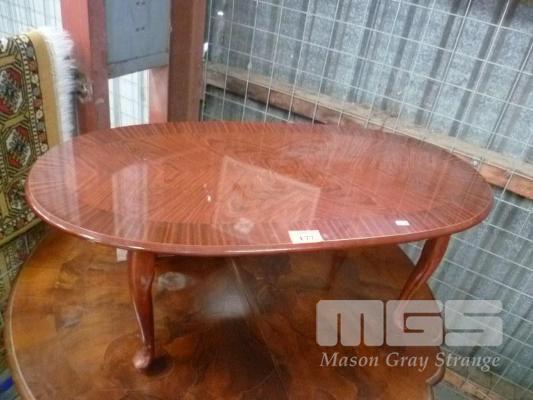 POLISHED TIMBER OVAL COFFEE TABLE, CABRIOLE LEGS
