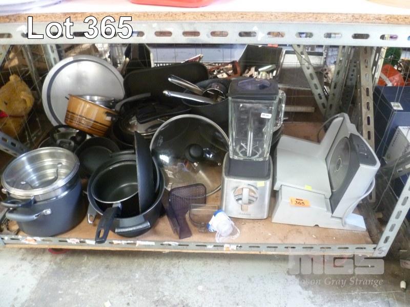 ASSORTED COOKWARE, SUNBEAM BLENDER, MEAT SLICER, ETC