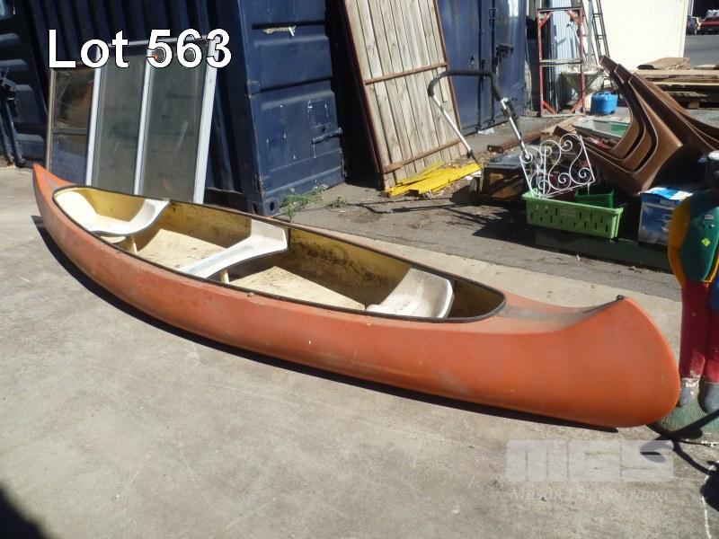 FIBREGLASS CANOE, ORANGE, 3 SEATS, 2 X PADDLES
