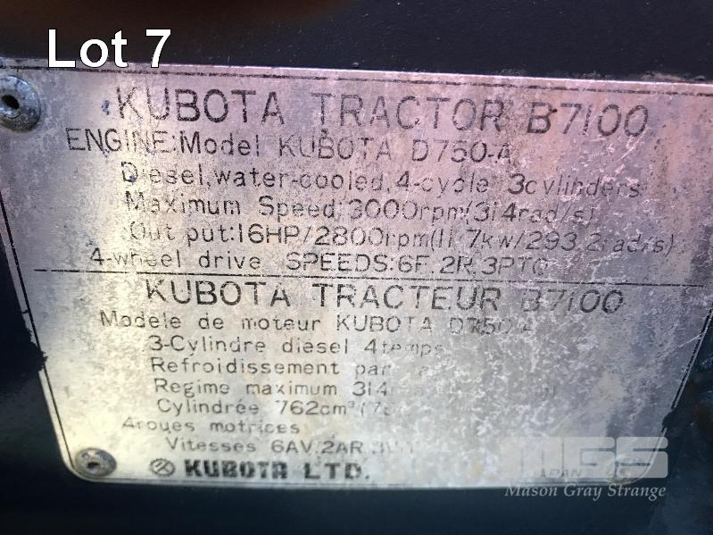 KUBOTA B7100 4x4 COMPACT BACKHOE TRACTOR HOURS: 3,189hours INDICATED 16HP 3 CYLINDER KUBOTA, 6 (HI/LOW) SPEED DIESEL, 3PL. PTO FITTED WITH FRONT LOADER ATTACHMENT 100cm GP BUCKET BACKHOE ATTACHMENT WITH STABILIZERS 25mm PIN 3 x BUCKETS, 250mm, 350mm & 450mm TRACTOR & ATTACHMENT HYDRAULICS FULLY REFURBISHED ACCORDING TO VENDOR KEY #5
