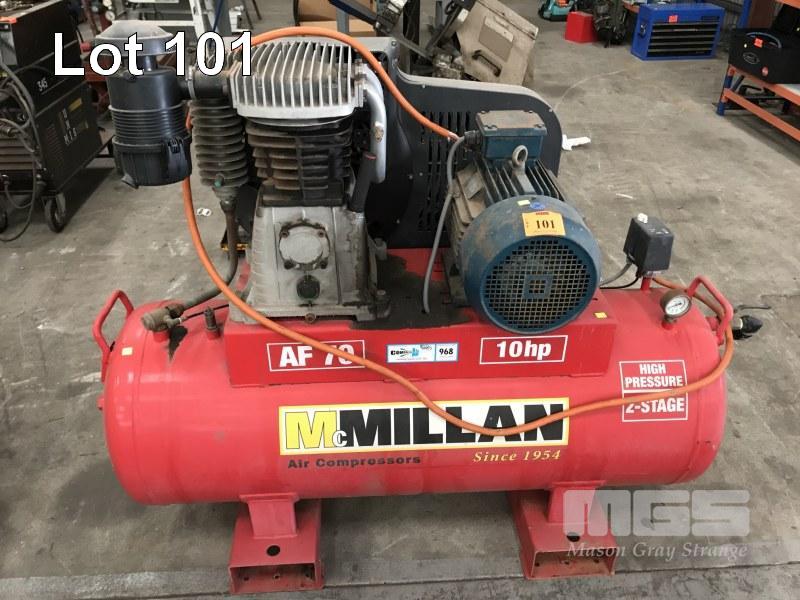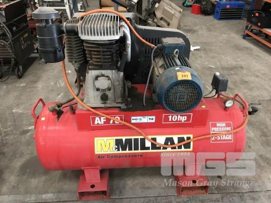 WORKSHOP AIR COMPRESSOR, MCMILLAN MOD: AF70 2 STAGE 968 LITRE/MINUTE 10HP BELT DRIVE, 415V FORK POCKETS