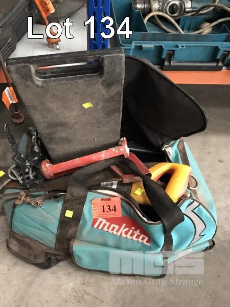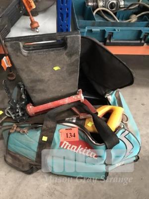 MAKITA TOOL BAG & CONTENTS ASSORTED HAND TOOLS, SAWS, SCREWDRIVERS, RIVETER, TAPE MEASURE, EXTENSION LEADS, ETC