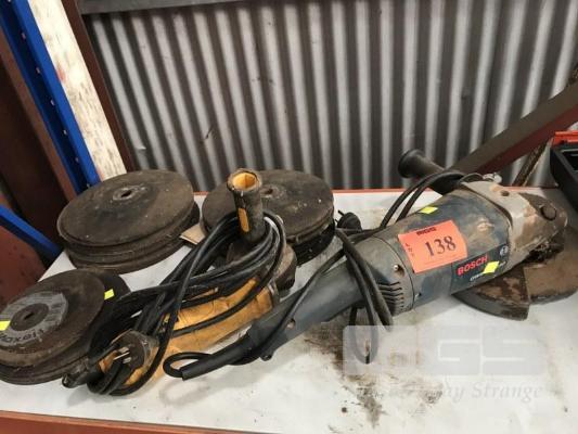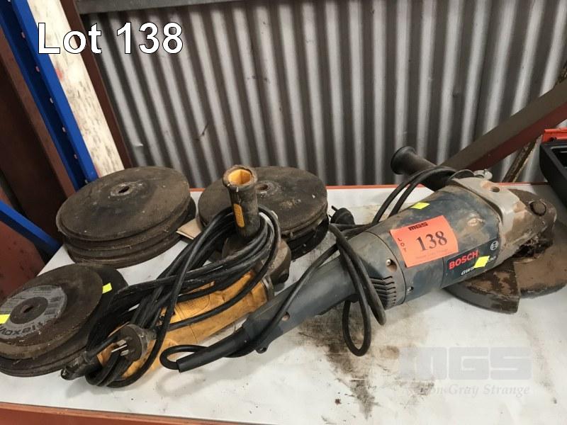 2 x ASSORTED ANGLE GRINDERS, BOSCH, 9" & DEWALT 100mm, 240V WITH ASSORTED CUTTING & GRINDING DISCS
