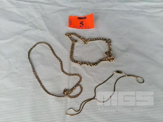 4.9gm THREE STRAND GOLD NECKLACE, 40cm, MARKED 9CT COMPRISING GOLD ROSE GOLD AND WHITE GOLD. GOLD PLATED COPPER FILLED NECKLACE, ITALIAN MADE. 3.92gm GOLD NECKLACE, 40cm, FLAT LINK MARKED "NZ375 ITALY".