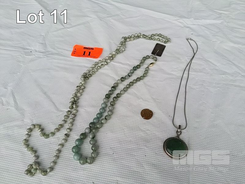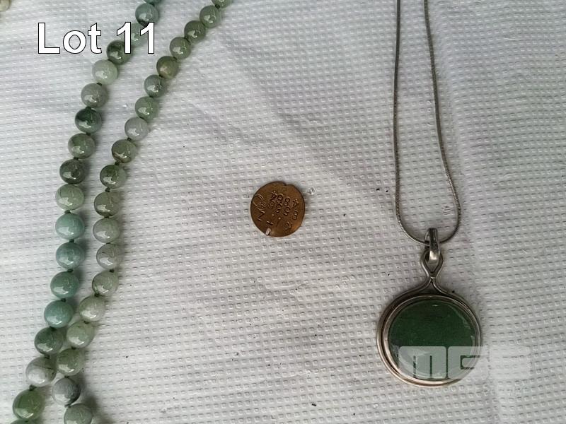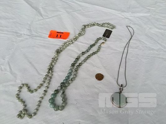 2 x JADE NECKLACES. PENDANT WITH SILVER CHAIN. SILVER EARRING AND DOG TAG.