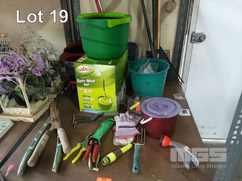 GARDEN IMPLEMENTS AND BUCKETS & MOPS.