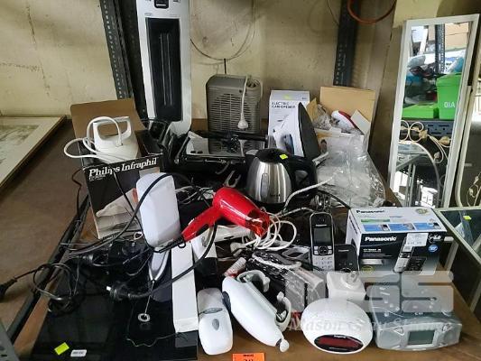 VARIOUS HOUSEHOLD ELECTRICAL INCLUDING CERAMIC HEATER, BLOW HEATER, ELECTRIC CAN OPENER, CLOTHES IRONS, TOASTED SANDWICH MAKER, TOASTER, KETTLES, MIXER, HAIRDRYERS, TELEPHONES, BATHROOM SCALES ETC (1 x BAY).
