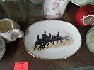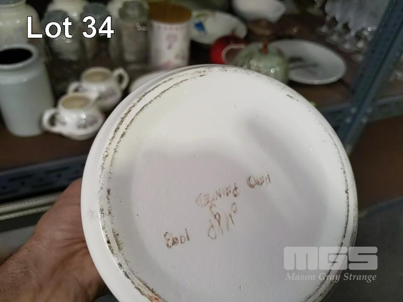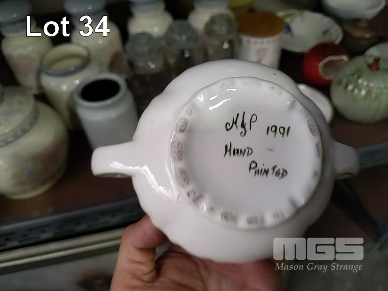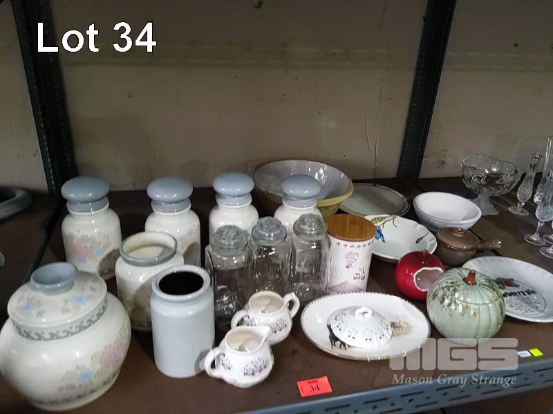 HAND PAINTED KITCHEN STORAGE JARS AND MILK JUG, PLATTER, PUMPKIN JAR & SUGAR BOWL AND OTHER PLATES, BOWLS JARS & POTS.