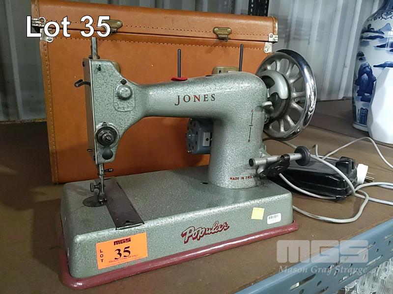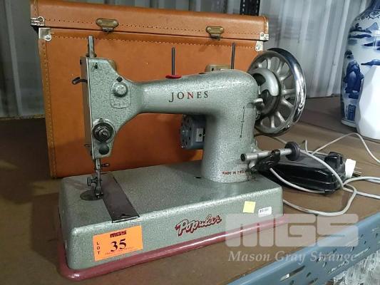 VINTAGE JONES POPULAR ELECTRIC SEWING MACHINE AND CASE.