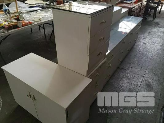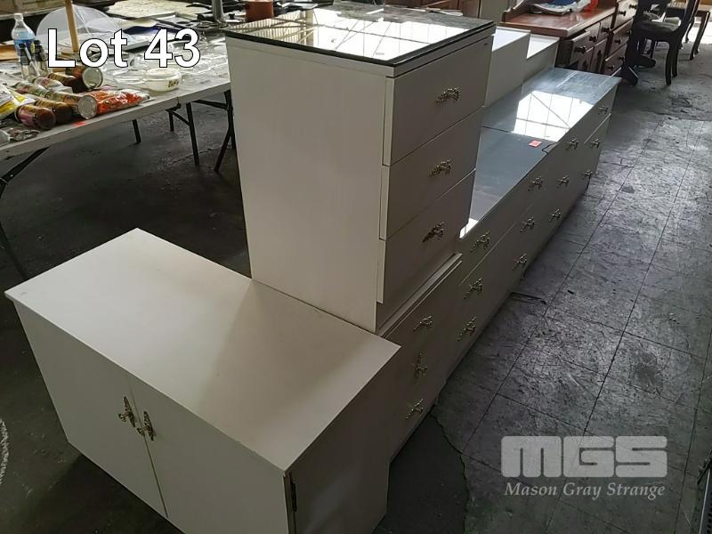 BEDROOM SUITE COMPRISING 2 x BEDSIDE TABLES, 2 x CHEST OF DRAWERS AND TWO DOOR SIDEBOARD CUPBOARD. ALL IN WHITE.