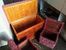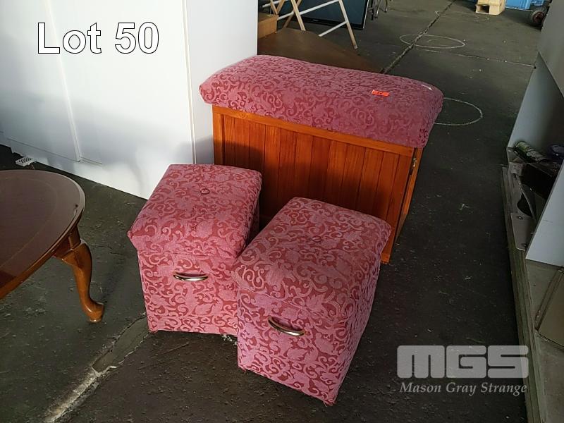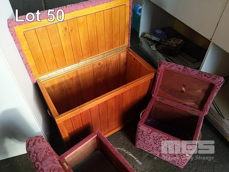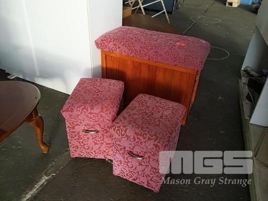 STORAGE CHEST WITH CUSHION TOP AND 2 x MATCHING CUSHIONED STORAGE BOXES.