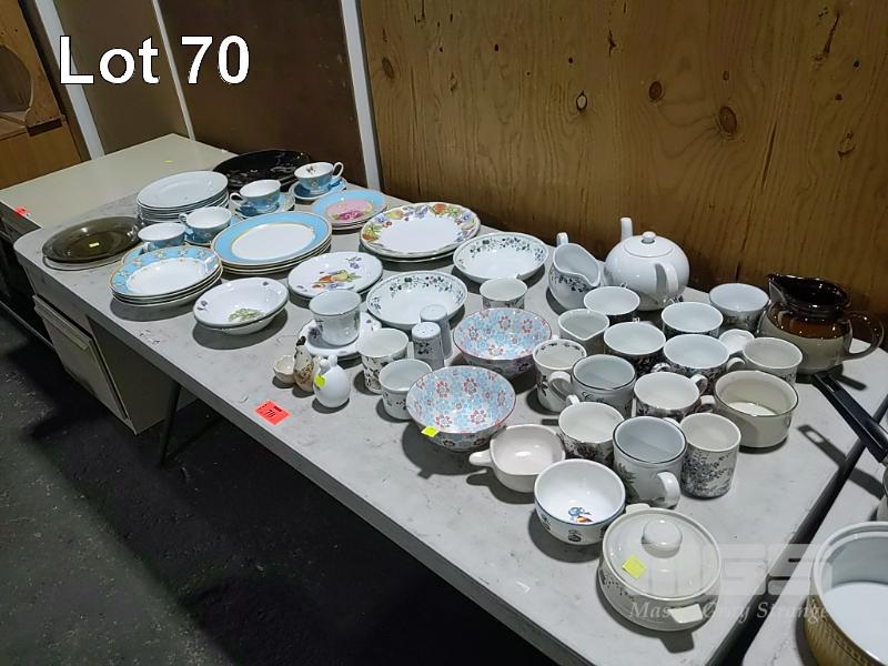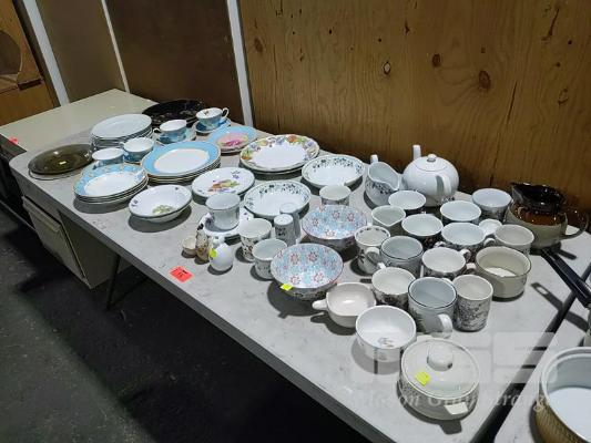 CROCKERY, PART DINNER SETS, CUPS & MUGS, TEA POT, JUGS ETC. (1 x TABLE).