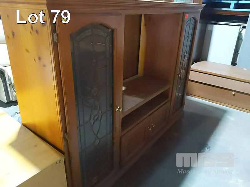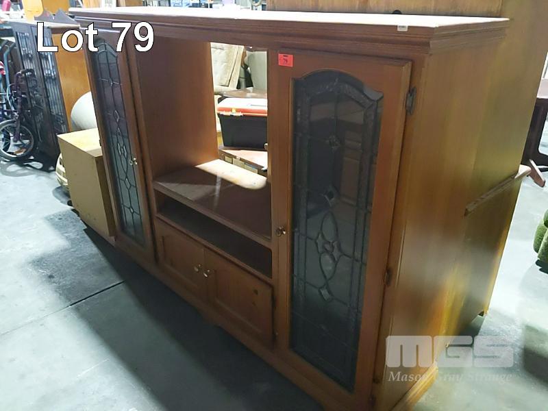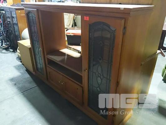 TIMBER TV CABINET WITH LEAD GLASS DOORS.