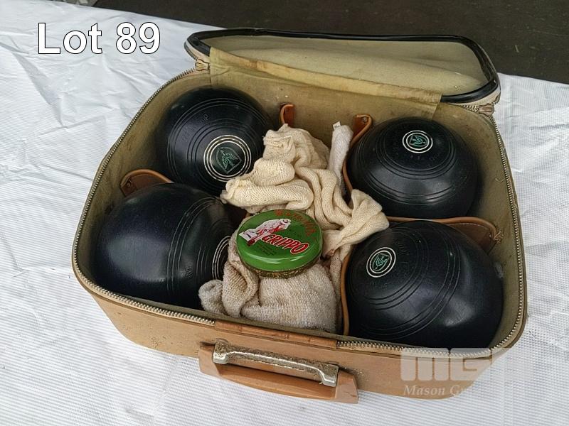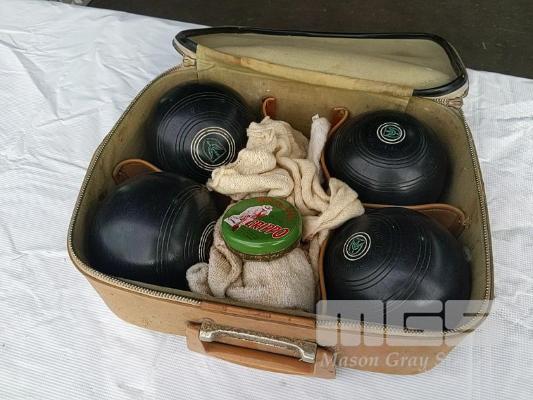 SET HENSELITE LAWN BOWLS IN CASE. SIZE 5/16.