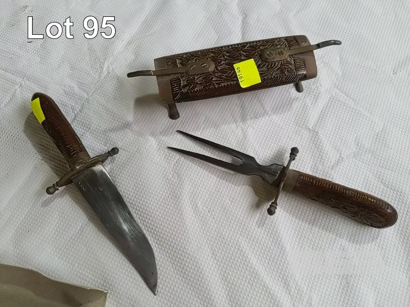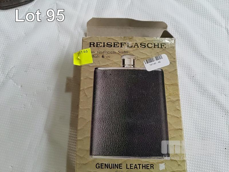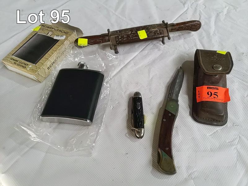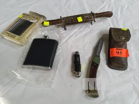 MEN'S LEATHER BOUND STAINLESS STEEL HIP FLASK, VINTAGE POCKET KNIFE, VINTAGE SCHRAD FOLDING KNIFE AND WOODEN BRASS INDIAN CARVING SET.