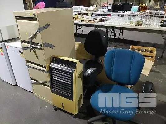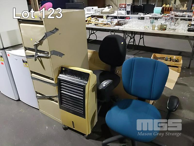 4 DRAWER FILING CABINET. 2 x OFFICE CHAIRS AND LINDA EVAPORATIVE AIR COOLER (KKG04-11BR1 MISSING A CASTOR)