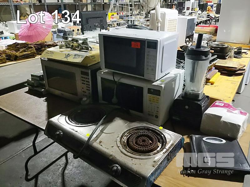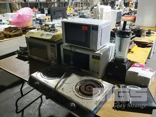 BOWIE TWINTOP PORTABLE GAS BURNER, 3 x MICROWAVE OVENS, QUIPWELL COMMERCIAL BLENDER, BATHROOM SCALES, TV WALL BRACKET, 6 x SMART POWER BOARDS ETC (1 x TABLE).