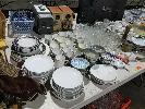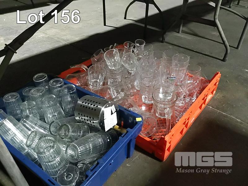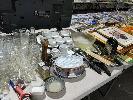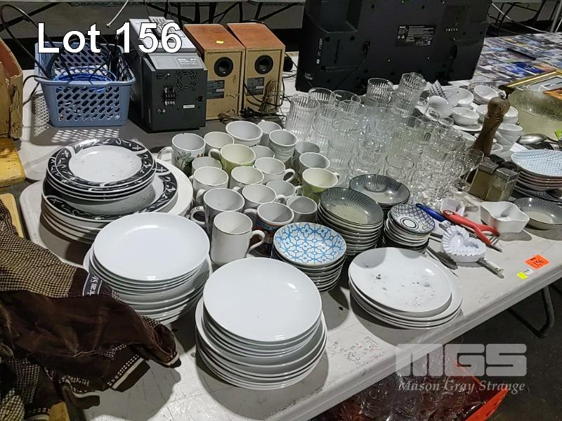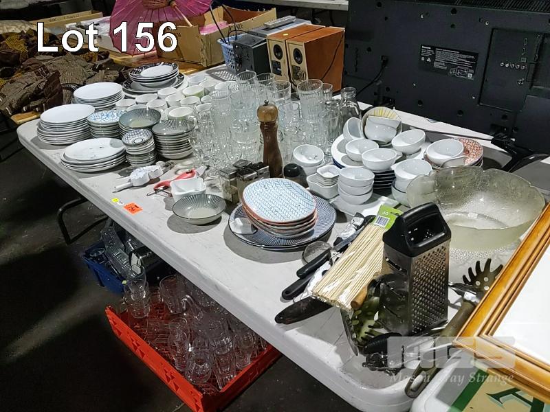 CROCKERY INCLUDING PLATES, BOWLS, SERVING PLATES AND CUPS & MUGS, KITCHEN UTENSILS, SALT AND PEPPER SHAKERS AND LARGE QUANTITY OF GLASSWARE INCLUDING JUGS, TUMBLERS, PORT GLASSES ETC (1x TABLE AND UNDER TABLE).