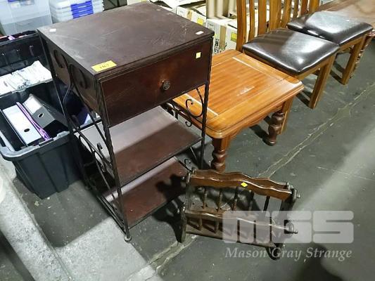 WROUGHT IRON STYLE SINGLE DRAWER METAL AND WOOD SIDE STAND WITH MAGAZINE HOLDER.