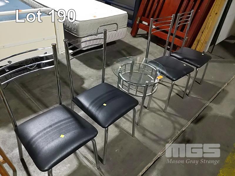 4 x CHROME STEEL CHAIRS WITH BLACK VINYL CUSHIONS AND MATCHING OVAL GLASS TOP COFFEE TABLE.