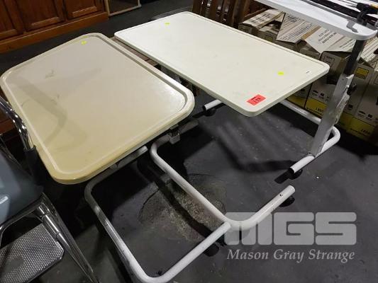 2 x MOBILE OVERBED TABLES. ONE MISSING CASTOR.