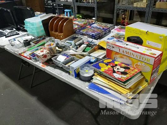 HOME OFFICE SUPPLIES PENS, DOCUMENT DRAWERS, STORAGE TRAYS, CACULATORS ETC. STATIONERY INCLUDING GIFT CARDS, BIRTHDAY CARDS, PADS AND ENVELOPES. FRELINE A4 LAMINATOR. PAPER SHREDDER AND MORE ( 1 X TABLE).