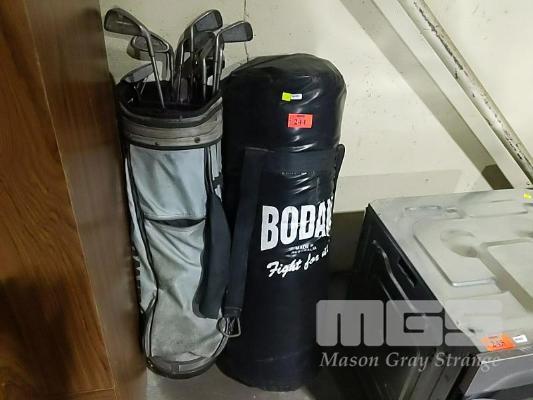 BODEN PUNCHING BAG AND SET OF 9 GOLF CLUBS IN BAG.