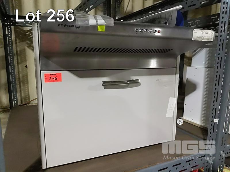 WESTINGHOUSE STAINLESS STEEL 3-SPEED DUAL FAN RANGEHOOD (WRJ611US - RRP $289.00) WITH WALL CABINET. ALL UNUSED, NEVER INSTALLED.