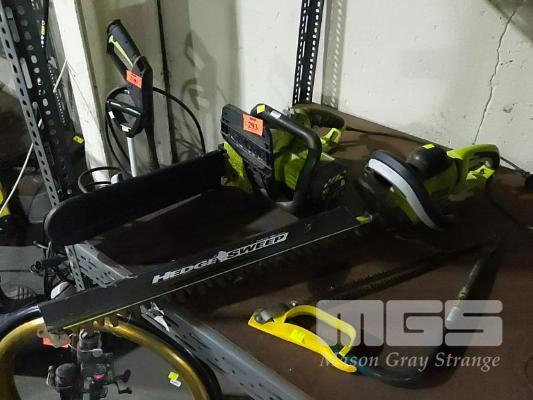 RYOBI 1900W ELECTRIC 240V CHAINSAW WITH 406mm BAR, RYOBI 240V ELECTRIC HEDGE TRIMMER (RHT600RLG) AND BRANCH SAW.