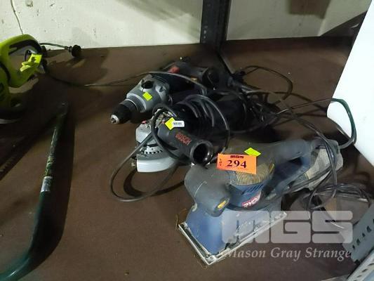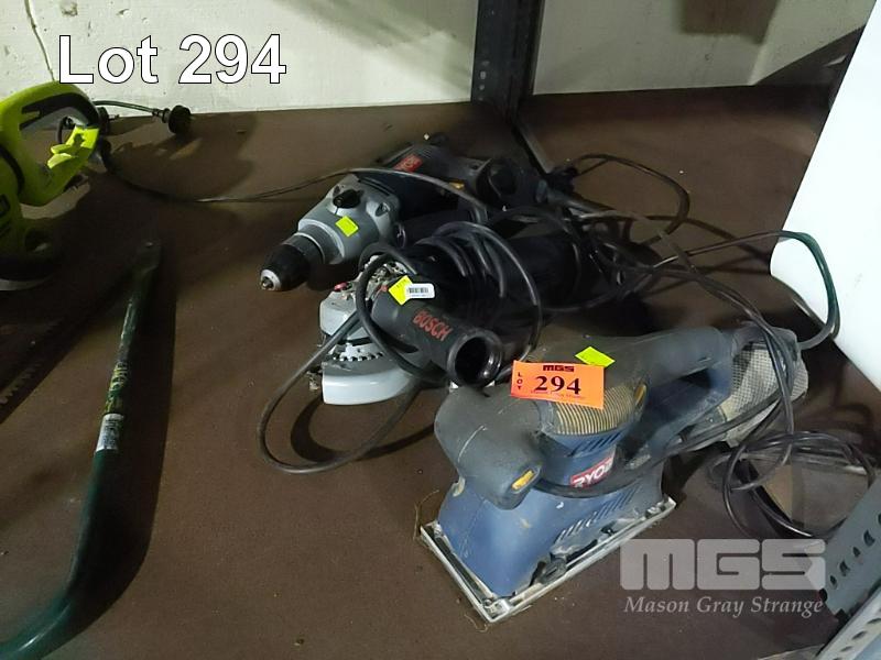 RYOBI SANDER, BOSCH ANGLE GRINDER AND RYOBI HAMMER DRILL.