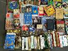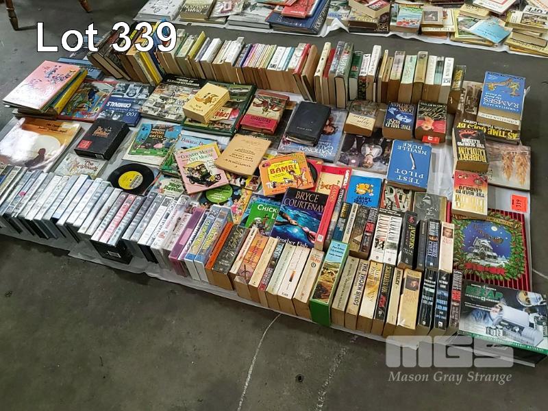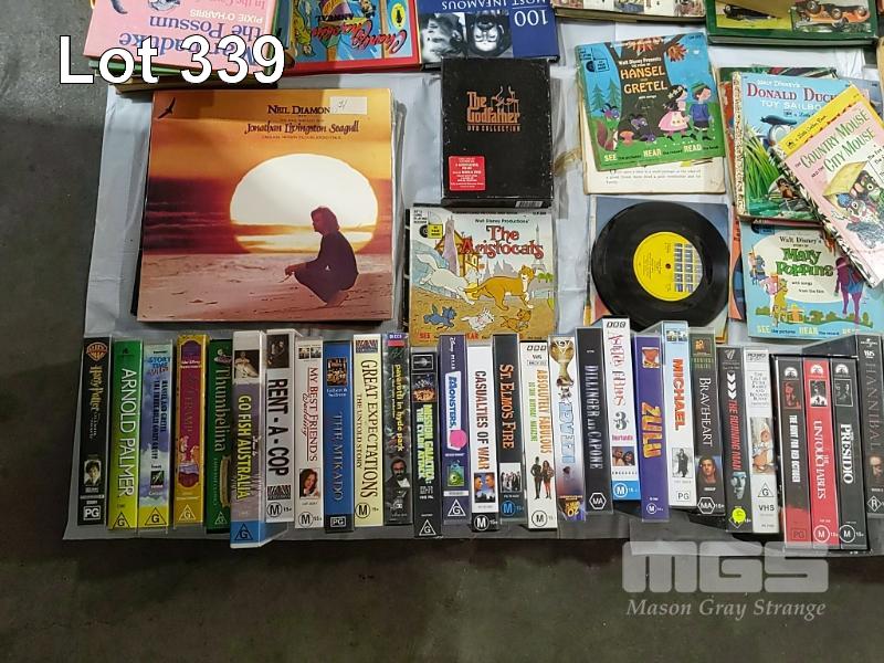 3 x BOXES OF BOOKS AND A BOX OF VINYL RECORDS AND VIDEOS (UNPACKED FOR DISPLAY)