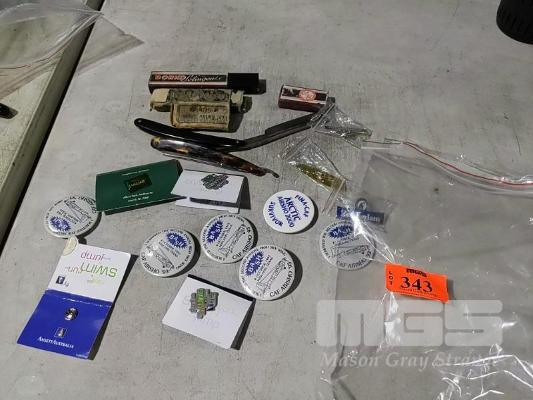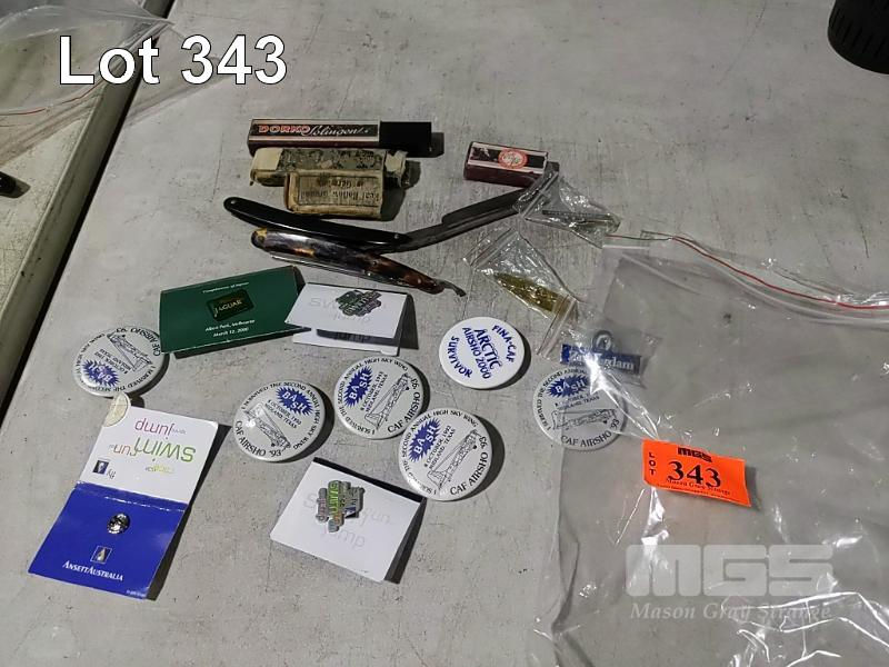 2 x VINTAGE CUT THROAT RAZORS IN ORIGINAL BOXES, BADGES & ANSETT PINS, ETC