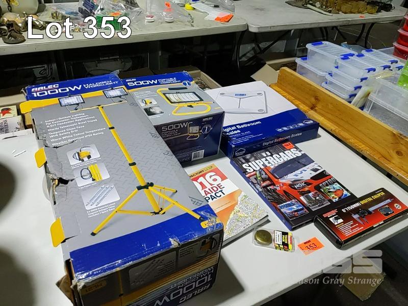 ASSORTED HARDWARE AND BOOKS INCLUDING ARLEC 1000W HALOGEN WORK LIGHT 500W PORTABLE HALOGEN WORK LIGHT DIGITAL BATHROOM SCALES SUPERCARS V8 BOOK DIGITAL CALIPER ETC