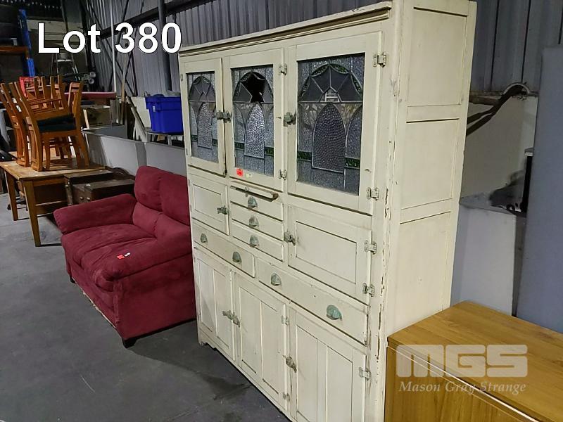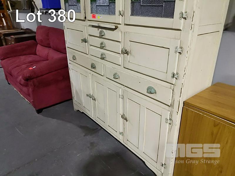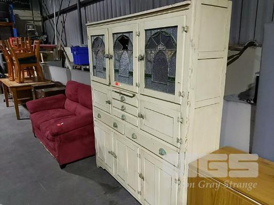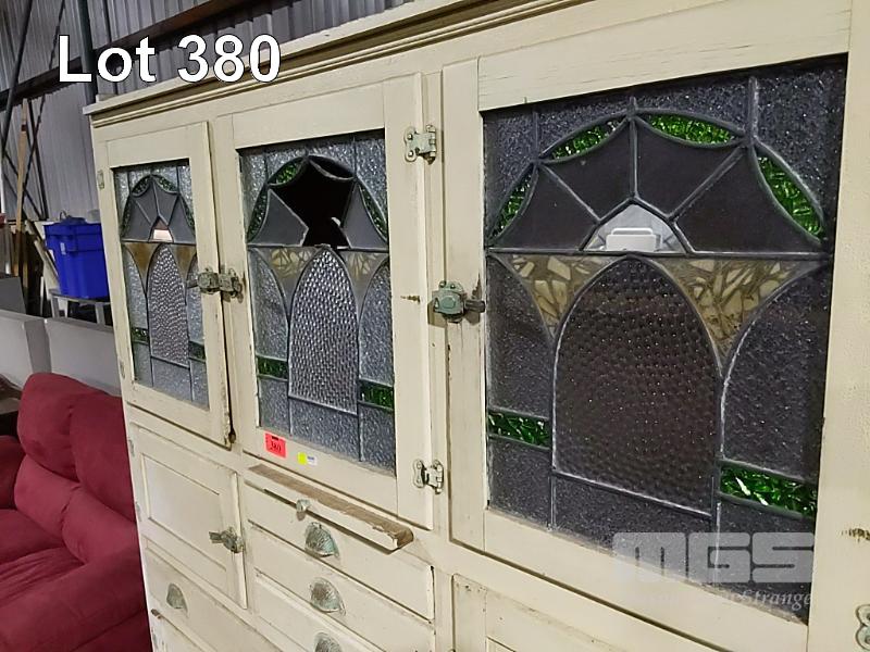 ANTIQUE KITCHEN CABINET WITH MEAT SAFE, PULL OUT CHOPPING BOARD, MULTIPLE DRAWERS, 3 x LEADLIGHT GLASS DOORS, (1 x DAMAGED)