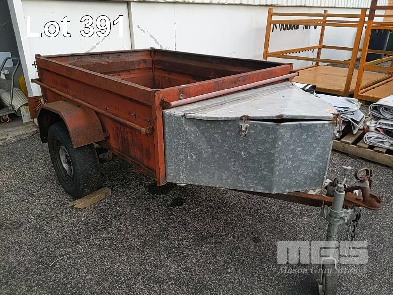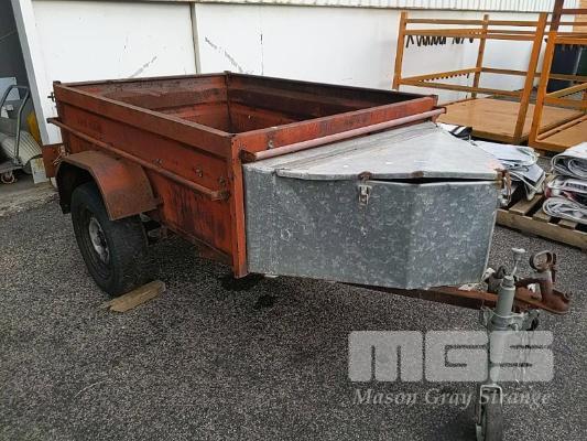 SINGLE AXLE 7 X 5 BOX TRAILER WITH BALL HITCH, JOCKEY WHEEL, GALV STEEL TOOL BOX (HAS CORRODED FLOOR)