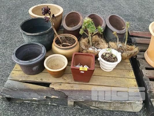 ASSORTED RUSTIC OVAL POTS, GLAZED CERAMIC POTS, HANGING BASKETS ETC