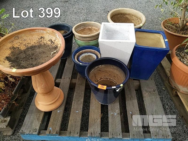 ASSORTED GARDEN POTS MEDIUM TO LARGE (12 ITEMS APPROX.) AND TERRACOTTA BIRDBATH.