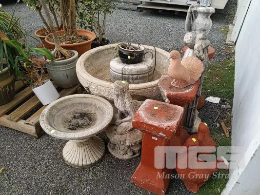 LARGE FOUNTAIN WITH PUMP AND WATER VENUS STATUE, GARDEN NYMPH, BIRD BATH, CONCRETE POT STANDS AND GARDEN DUCKS.