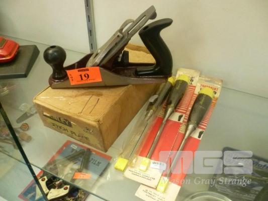 STANLEY WOOD PLANE & 3 x NEW OLD STOCK CHISELS