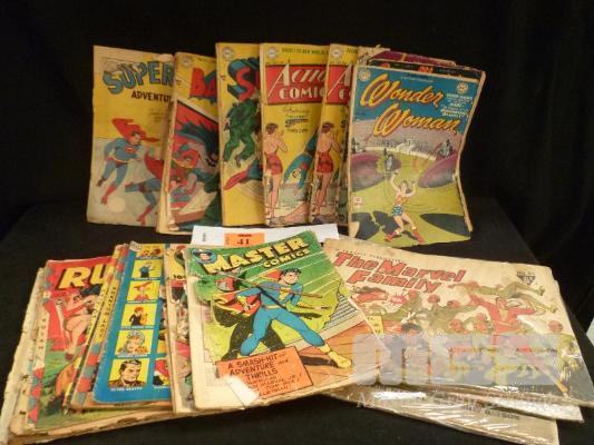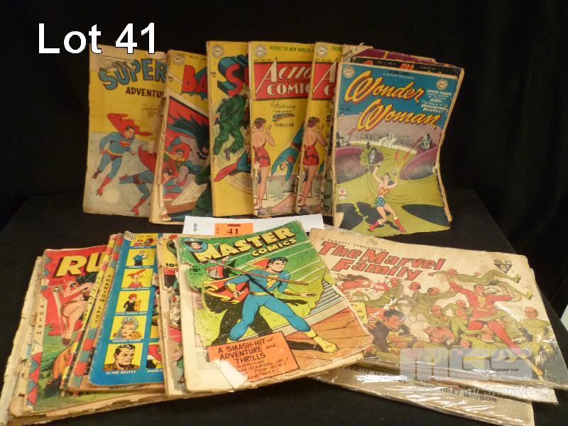 ASSORTED MID CENTURY SUPER HERO COMICS INC BATMAN, SUPERMAN MASTER COMICS, WONDER WOMAN, FLASH COMICS, ETC