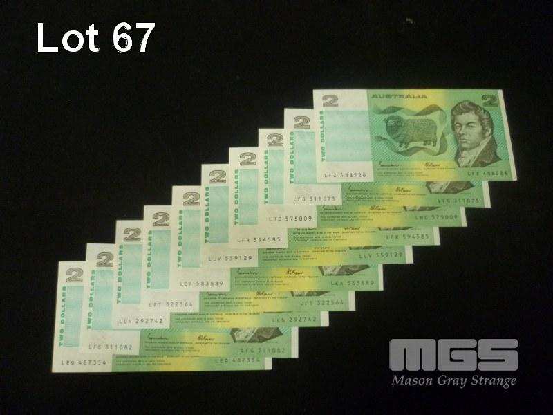 1985 10 x $2.00 NOTES MIXED PREFIX AND GRADES JOHNSTON FRAZER
