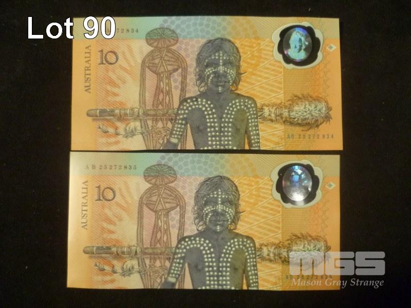 2 x AUSTRALIAN CONSECUTIVE 1988 COMMEMORATIVE $10.00 POLYMER BANK NOTES, FRASER/JOHNSTON, AB25272834-835