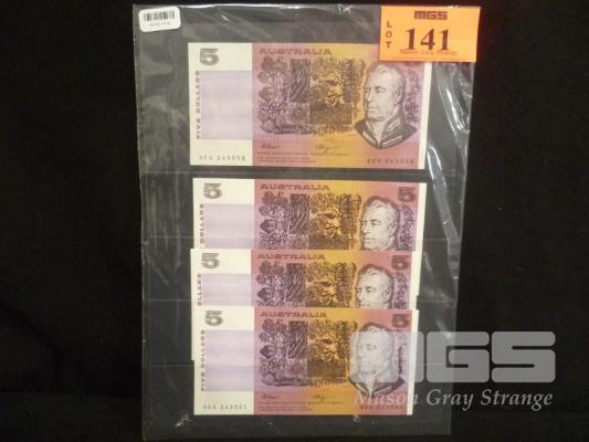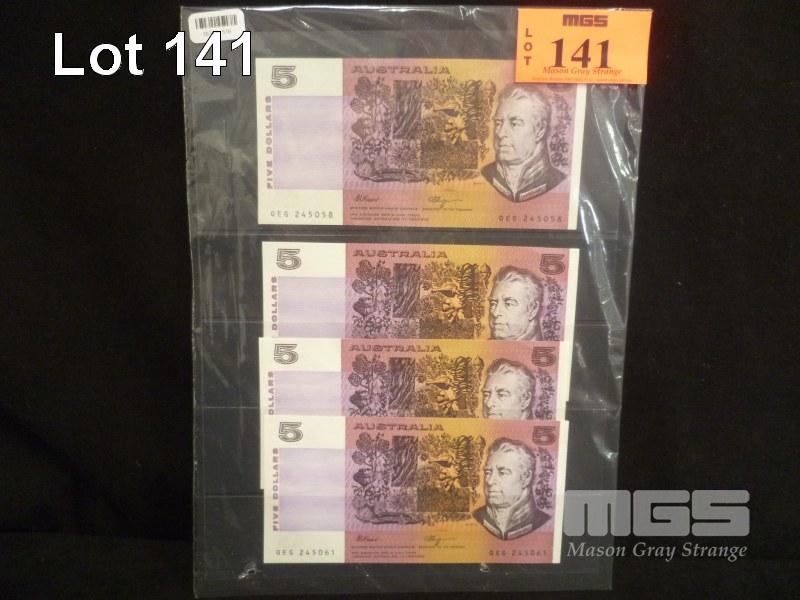 4 X CONSECUTIVE, AUSTRALIA, $5 PAPER BANK NOTES, FRASER/HIGGINS, QEG 245058 - 061
