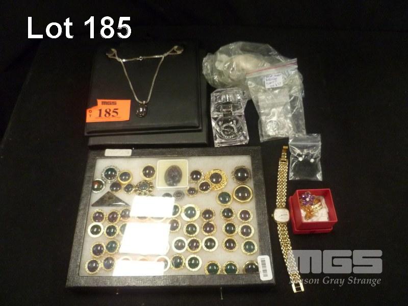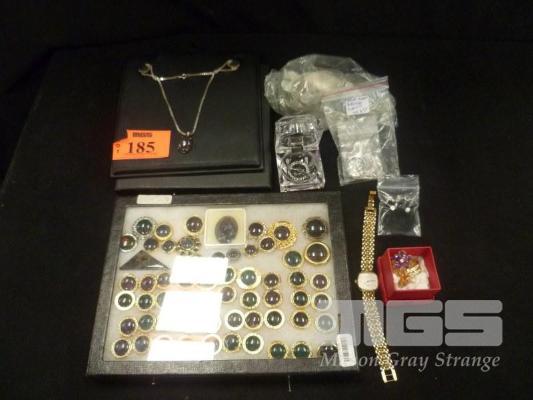 TRAY OF MATRIX DOUBLET BUTTONS, SOLID MATRIX OPAL PENDANT ON SILVER NECKLACE, 3 X RHODIUM PLATED RINGS, DRESS JEWELLERY, BUTTONS & LONGINES WRIST WATCH